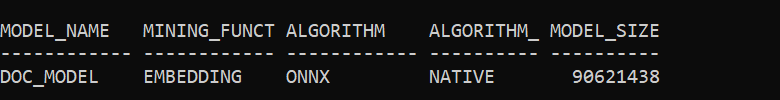 EXECUTE DBMS_VECTOR.LOAD_ONNX_MODEL(‘DM_DUMP’,’all-MiniLM-L6-v2.onnx’,’doc_model’)
